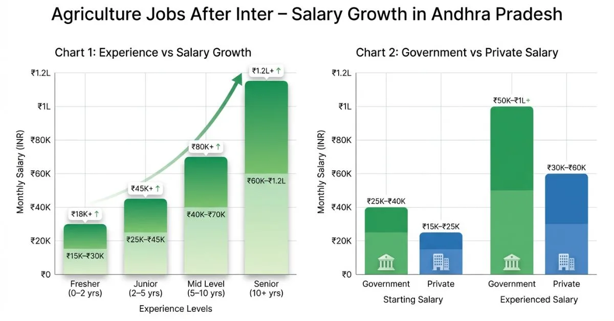 Salary comparison గురించి ఇంకా తెలుసుకోవాలంటే “Agriculture Salary & Career Growth” article చూడండి.