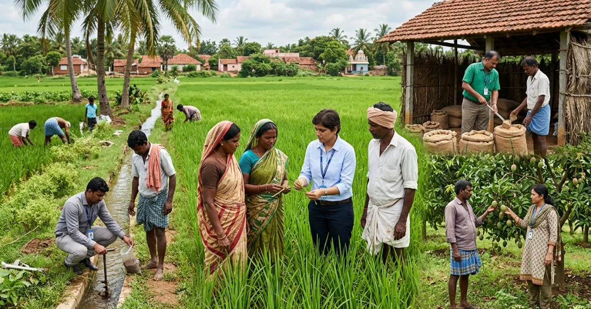 APPSC Agriculture Jobs officers guiding farmers and inspecting crops in Andhra Pradesh agriculture fields