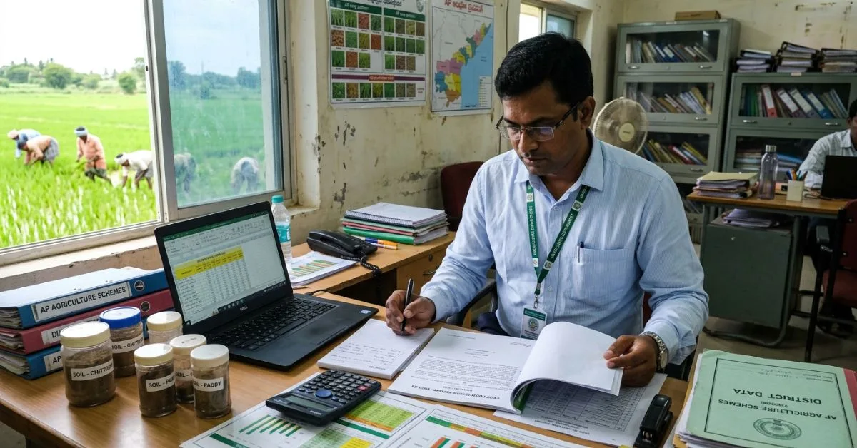 APPSC Agriculture Jobs officer reviewing salary documents and agriculture department reports in office