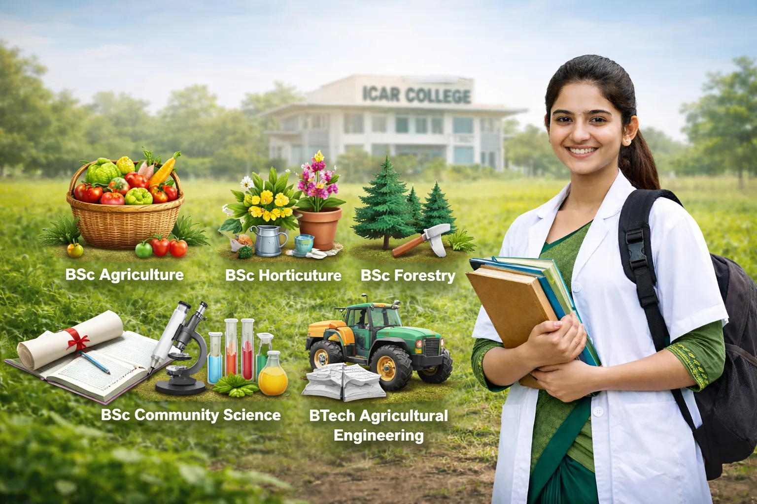 Smiling Indian female student in lab coat standing in front of ICAR College with lush agricultural fields, holding books. Visual icons represent BSc Agriculture, BSc Horticulture, BSc Forestry, BSc Community Science, and BTech Agricultural Engineering, along with theory, practical, and field work elements.