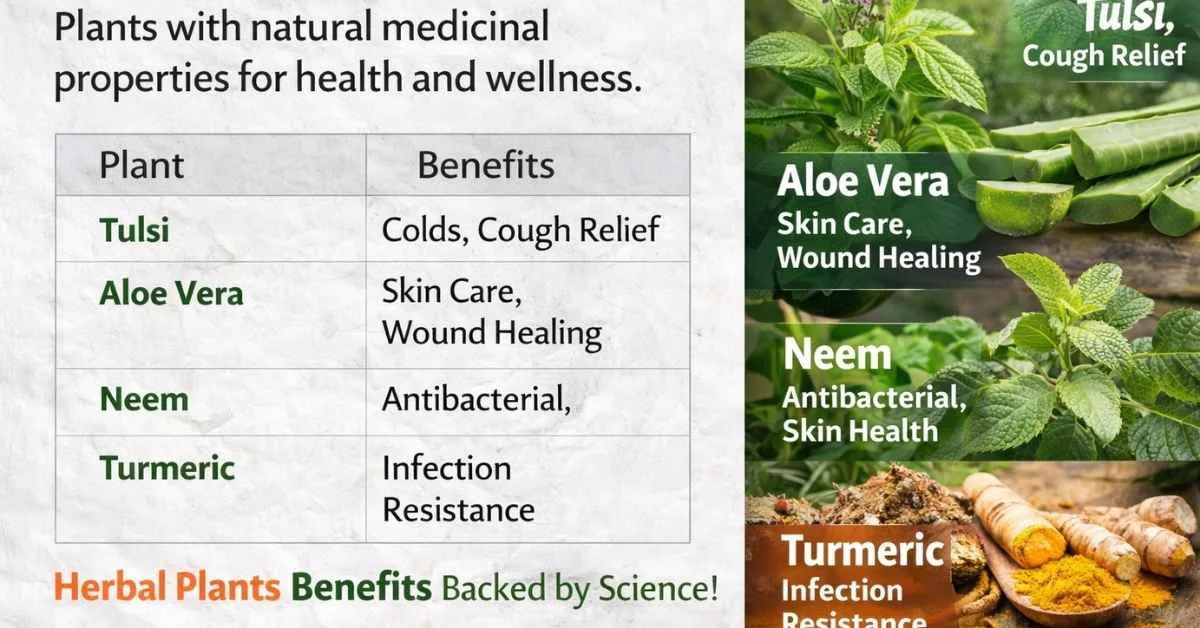 Herbal Plants Benefits image showing natural herbs like Tulsi, Aloe Vera, and Neem for health improvement