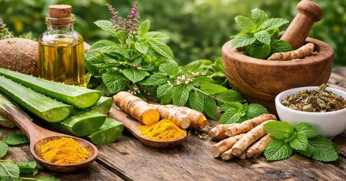 Realistic photo showing herbal plants like Aloe Vera, Neem, Tulsi, Turmeric, and Ashwagandha used for health and wellness